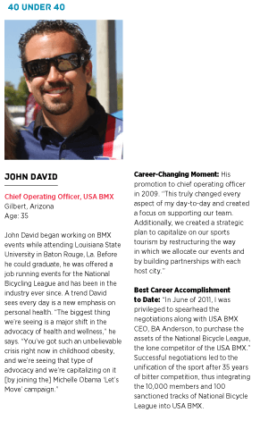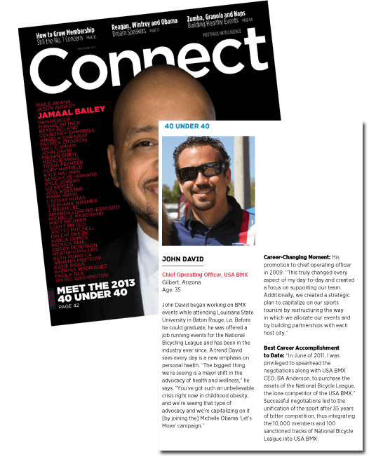 John David, chief operating officer, USA BMX, was recognized as an industry leader in Connect magazine’s “40 Under 40” feature in the May/June issue. Connect Magazine is a national, B2B magazine that provides resources and ideas to association and specialty group meetings professionals.