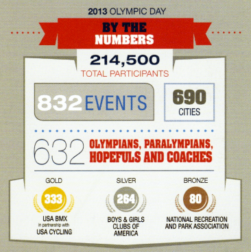 Out of the 832 Olympic Day events in 690 cities, 333 of them were USA BMX races. This is a great example of the growing popularity and exposure that BMX Racing is receiving in the Olympic realm. Thanks to all Olympic Day participants and USA BMX tracks and volunteers for making BMX Racing the No.1 sport in all of the Olympic Day activities.