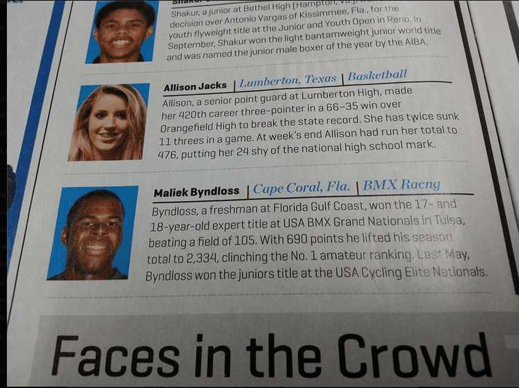 While most people won't stop talking about the Seahawk's Sherman - and his appearance on the latest front cover of Sports Illustrated, there's a cool little treat inside for BMXers - with a short mention of USA BMX's National No.1 Amateur in the traditional FACES in the CROWD section - which gives a nod every month to top amateur athletes around the country. As the newly crowned No.1 Am, Maliek was an obvious choice.