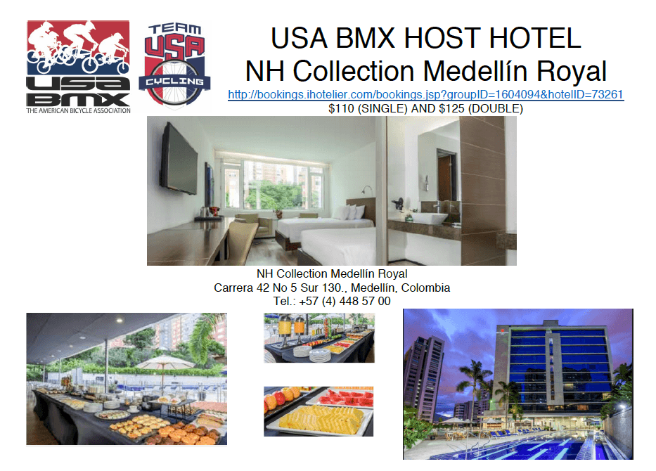 The NH Collection Medellín Royal has been named as the host hotel for the Team USA challenge class riders for the 2016 UCI BMX World Championships. All team meetings, distribution of materials, and team transportation will occur from this location.