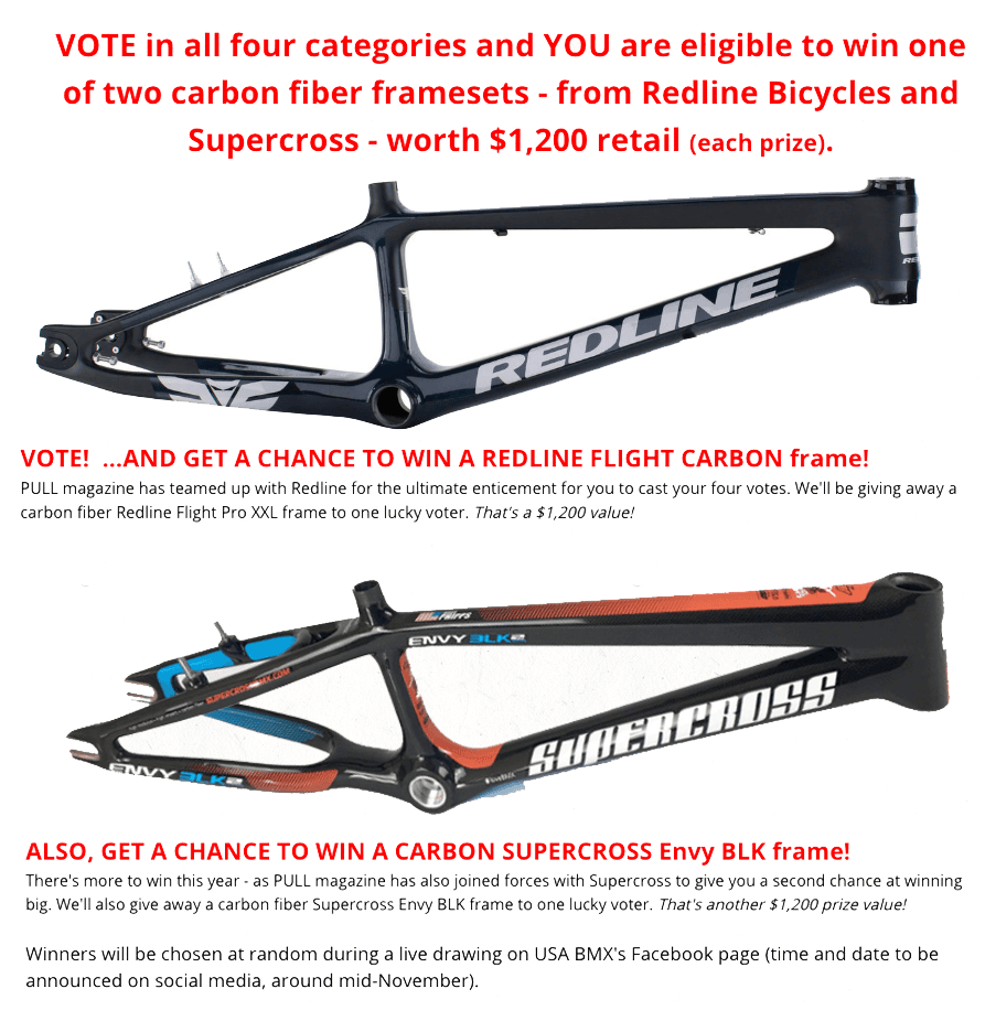 Vote in all four categories and you are eligible for a drawing to win one of two carbon fiber framesets – from Redline Bicycles and Supercross BMX – each $1,200.