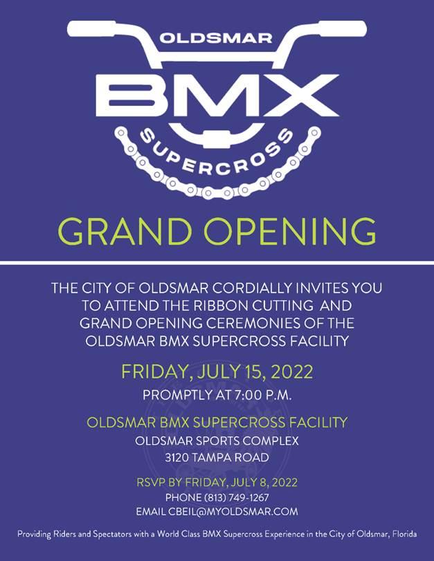 The City of Oldsmar is excited to invite the entire BMX World to the Grand Re-Opening of the Oldsmar BMX Supercross Track on Friday, July 15th at 7 pm (gates will open at 6 pm). Please send your RSVP to Caren Beil at [email protected] by Friday, July 8th.
