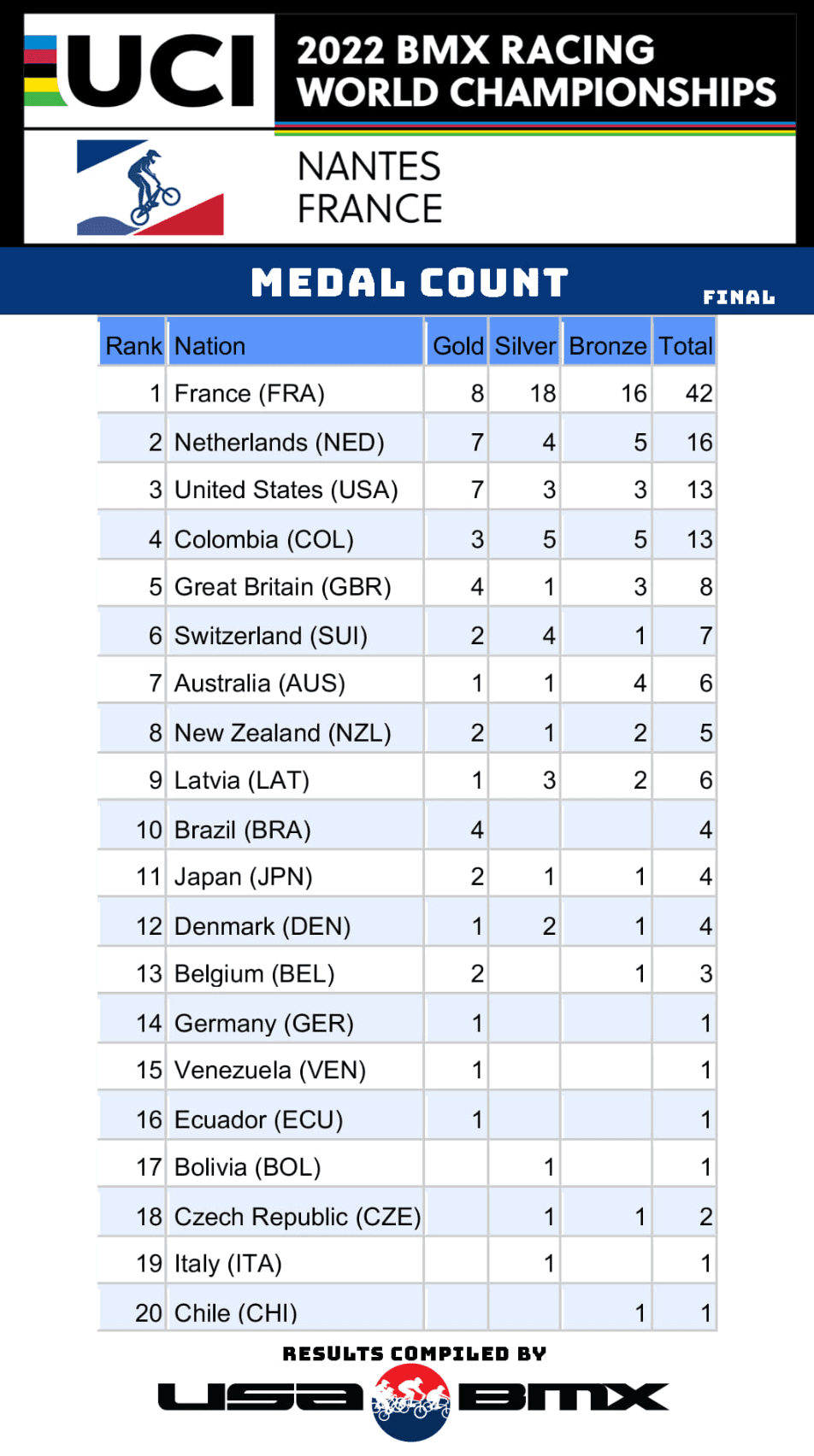 In the end, Team USA scored a total of 13 medals - with seven of them in the color of Gold (tied with the Dutch for secon-most wins). Home country France, with duoble the number of riders under their 25 pit tents, did as expected with 42 podium finishes - yet only one more win than the USA and Netherlands.