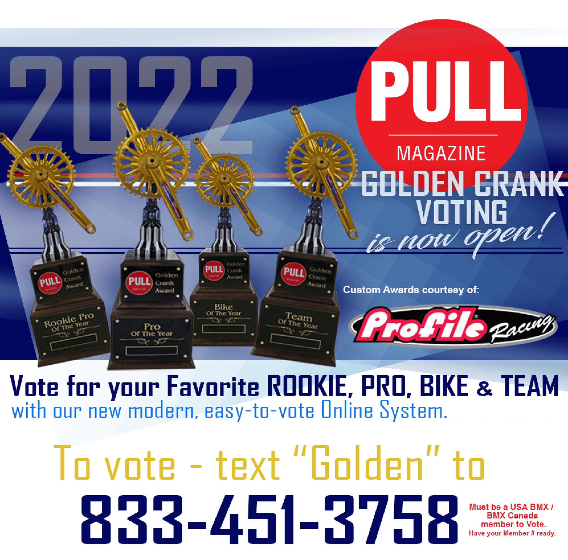 USA BMX and BMX Canada members are invited to cast their ballot for your favorite PRO, ROOKIE PRO, BIKE & FACTORY TEAM. And it's now easier than ever with our modern, easy-to-vote Online System. To vote - text “Golden” to 833-451-3758.