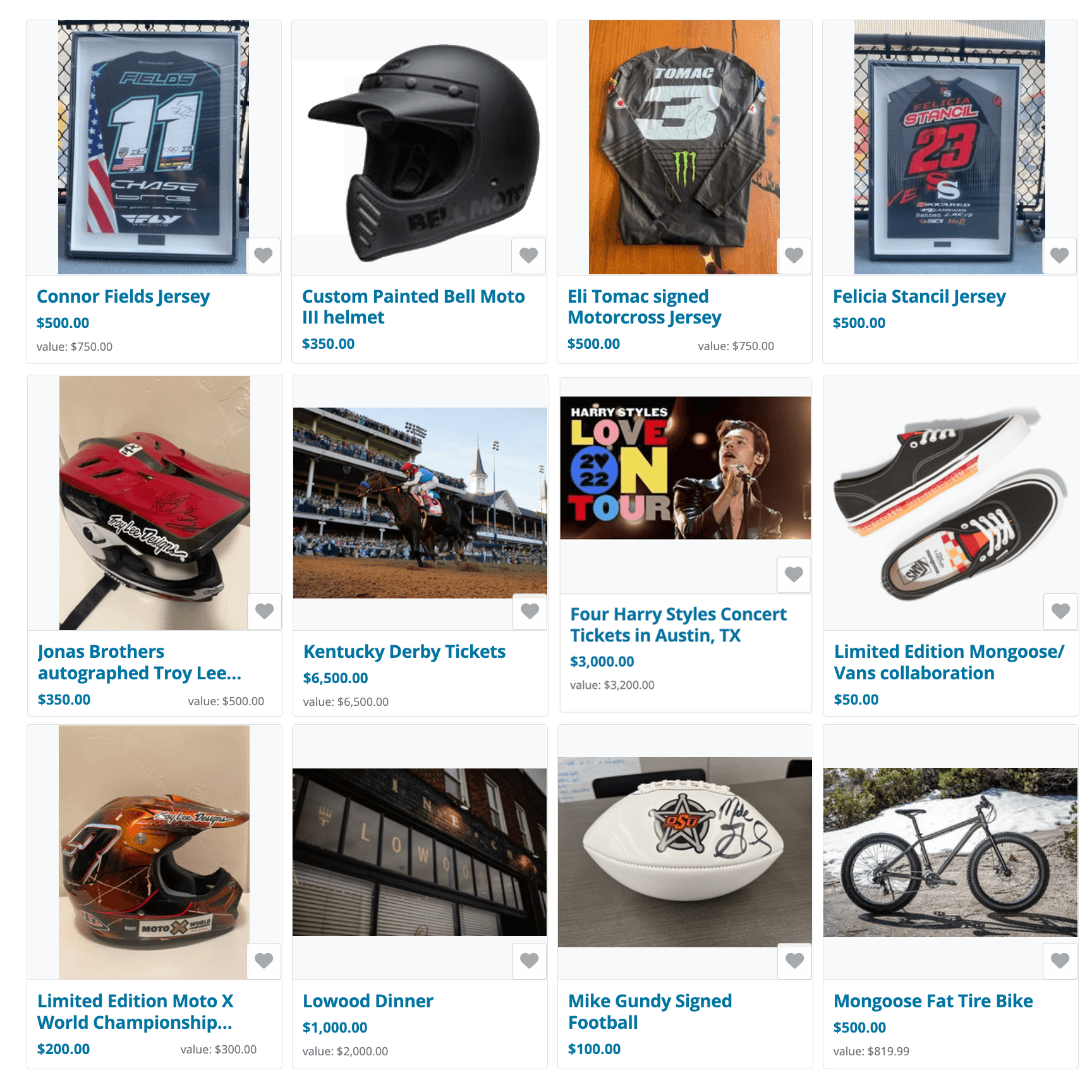 Items from NFL, Kentucky Derby, BMX, and action sports icons have been donated for the