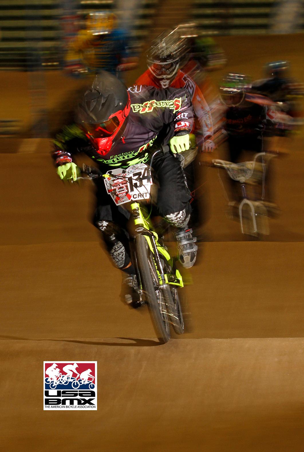 When it came time to build the Reno track, builder Billy Allen's goal was to do something a little different than the usual - and what the hundrreds of riders saw when they arrived at the Reno-Sparks Livestock & Events Center, was not the same ol' same ol indoor build. "It's different," was the most common comment heard by top experts. "I love it," summed up Extreme Team's Robby Patterson, who used the giant first turn to his advantage in Friday's 19-27x main. Obstacles such as a roller-table for the first jump, or a step-double in to a raided double down the second straight is proving to be fun for racers of all ages - young and old, and is keeping the flow going fast as they head down the jump-infested third straight. With two 90'degrees turns and a rhythm-filled last straight away, this year's Blackjack track is getting a ton of positive praises by all.