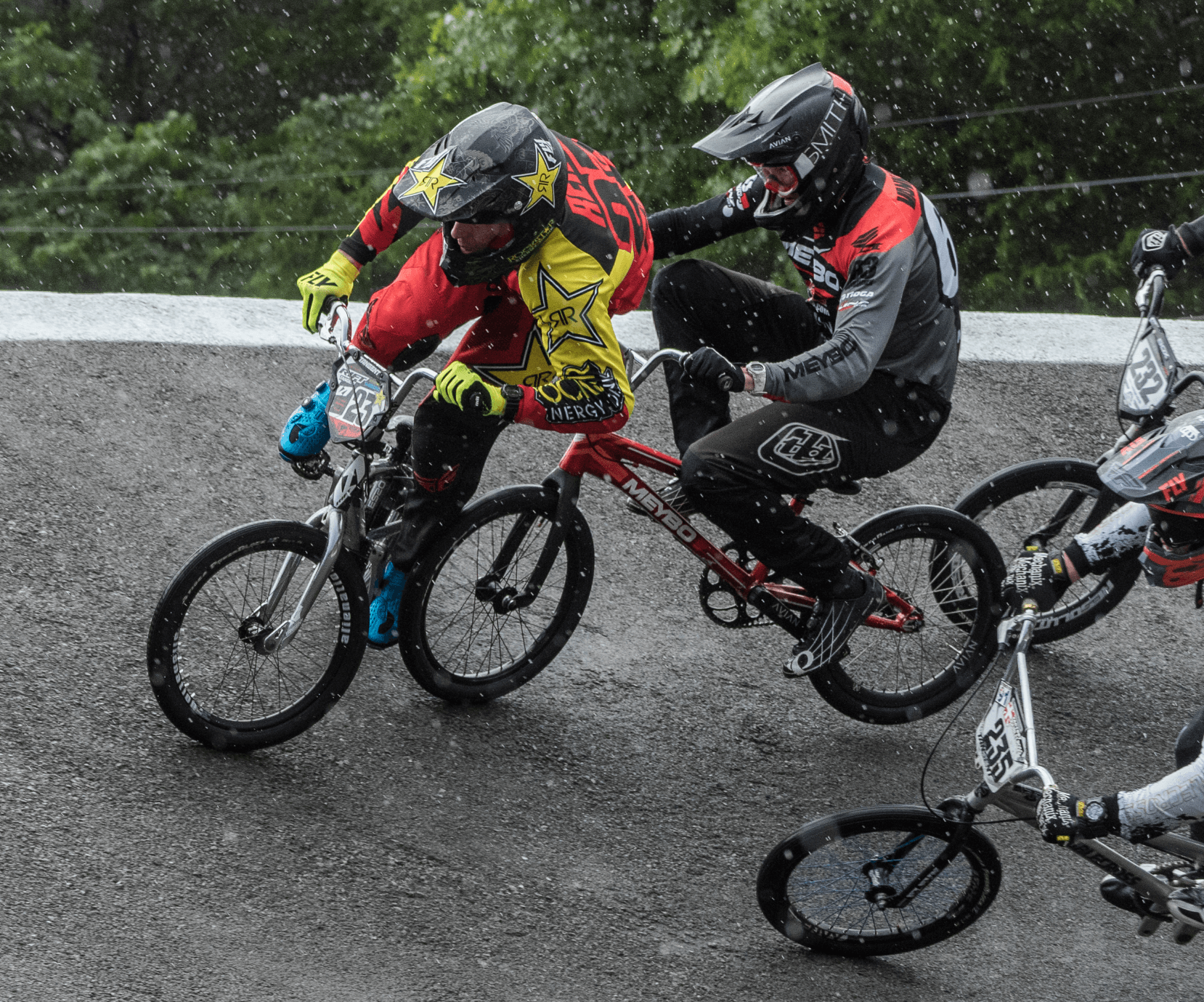 Pros were running on a schedule, which meant every 90 minutes, they'd be called to the gate. As luck (bad luck, that is) had it, the A-pro semis and all Pro finals would take place during the rainy, wettiest conditions of the day. But with the incredible, rain-proof Music City track surface, where workers were literally squeegee'ing off the track, the Pros weren't likely going to back off much when money and Pro points on the line.