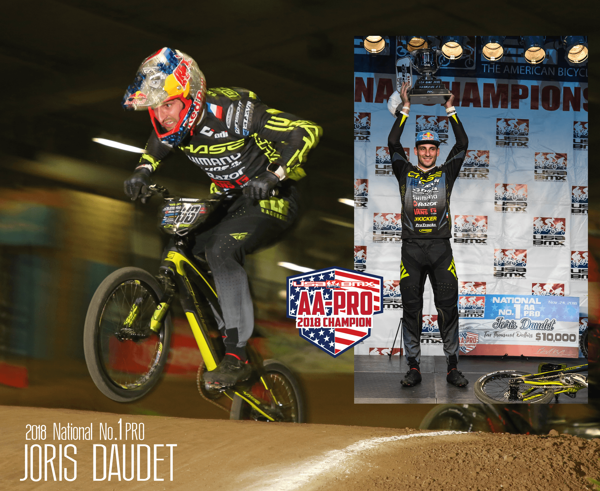 Men’s AA Pro - France’s Joris Daudet won each of the three main event finals to secure his third USA BMX National #1 Pro Title. With the win, Daudet joined the ranks of past champions Bubba Harris and Sam Willoughby who each have three titles to their name. Joris’ third title in four years capped a steller 2018 season that saw the ‘Flying Frenchman’ atop the podium an amazing 16 times. Daudet was joined on the Grands podium by Australian Anthony Dean, second, and Connor Fields, third. Fields ended the season second overall.