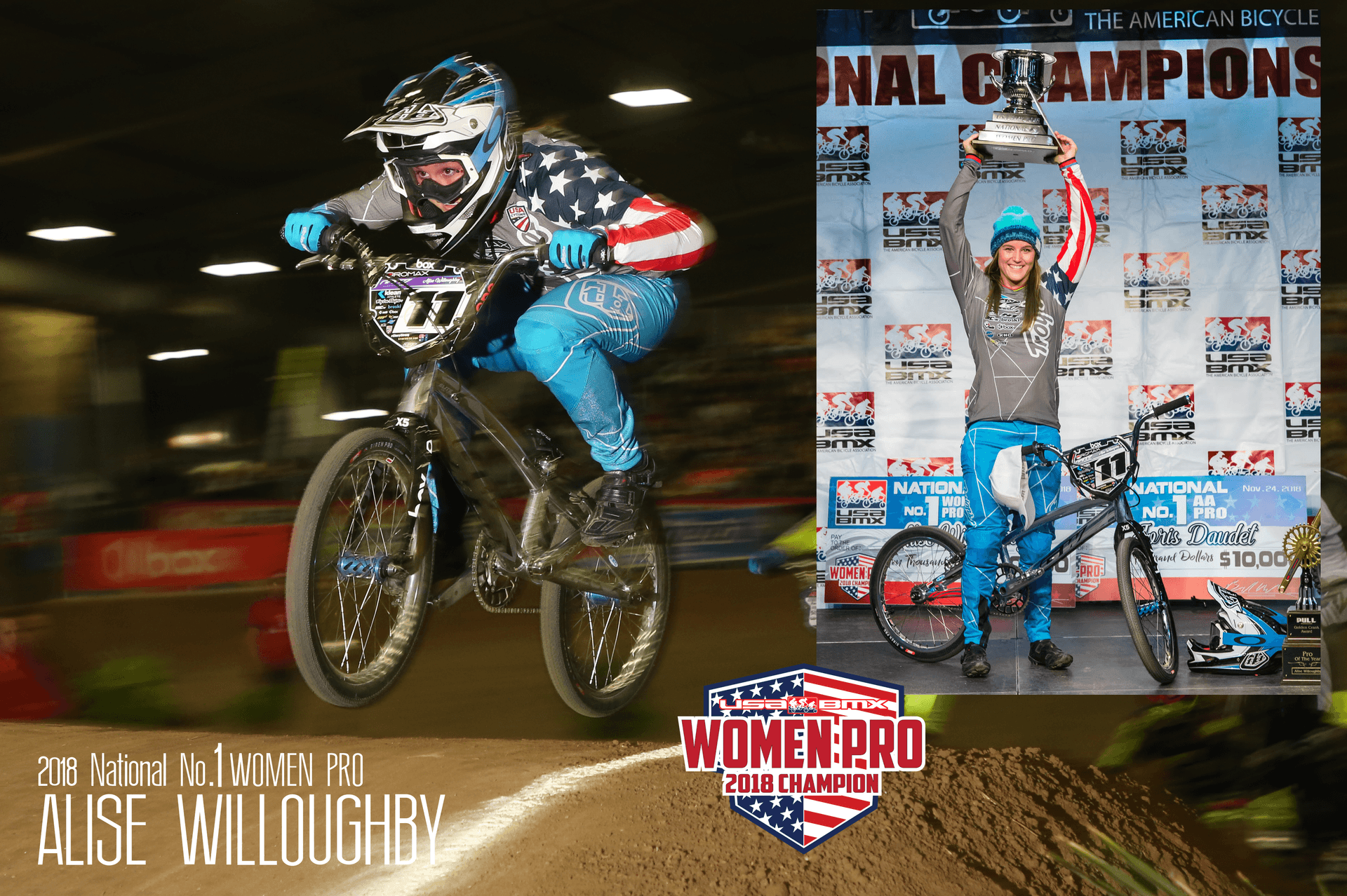 Women’s Pro Class - Alise Post Willoughby claimed her fifth consecutive National #1 Women’s Pro Title and secured her seventh overall pro title - increasing her lifetime record to 11 National #1 Titles (Alise also has four Amateur National #1 Titles to her name). Alise also accomplished something no other rider, male or female, has ever done winning every main event she raced in a season. Joining Alise on the Women’s Pro Grands podium Saturday night were Supercross BMX rider Rachel Mydock, third, and Alise’s close friend and Olympic teammate Brooke Crain, second.